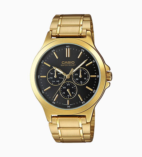 Casio Multi-Dial Stainless Steel Men’s Watch MTP-V300G-1AV – Gold Tone • Water-resistant • Date, day, and 24-hour indicator • Stainless steel band